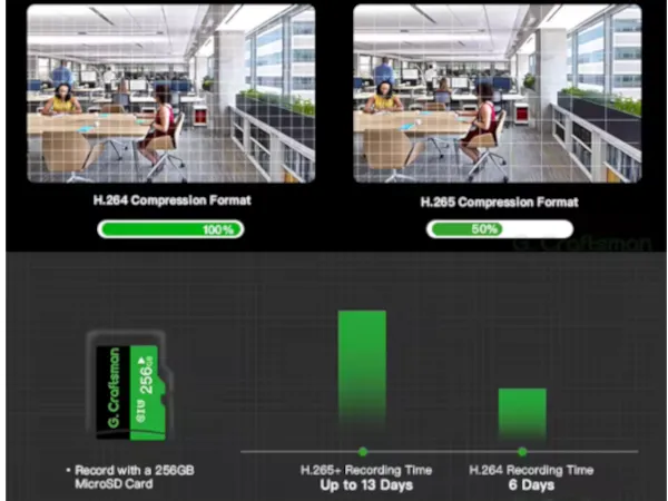 Dzięki technologii H.265, G.Craftsman zapewnia nie tylko efektywne zarządzanie danymi, ale także zwiększoną wydajność całego systemu monitoringu, co czyni go doskonałym wyborem dla użytkowników ceniących sobie jakość, niezawodność i optymalizację zasobów.