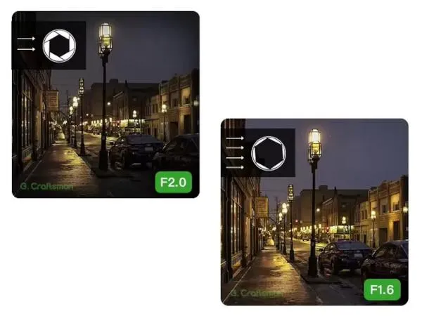 Kamera G.Craftsman wyposażona jest w duże przysłony o wartości F1.6, co pozwala na przechwytywanie o 1.7 raza więcej światła w porównaniu do standardowych kamer. Ta cecha znacząco wpływa na jakość obrazu, poprawiając jego ekspozycję, szczególnie w warunkach słabego oświetlenia.